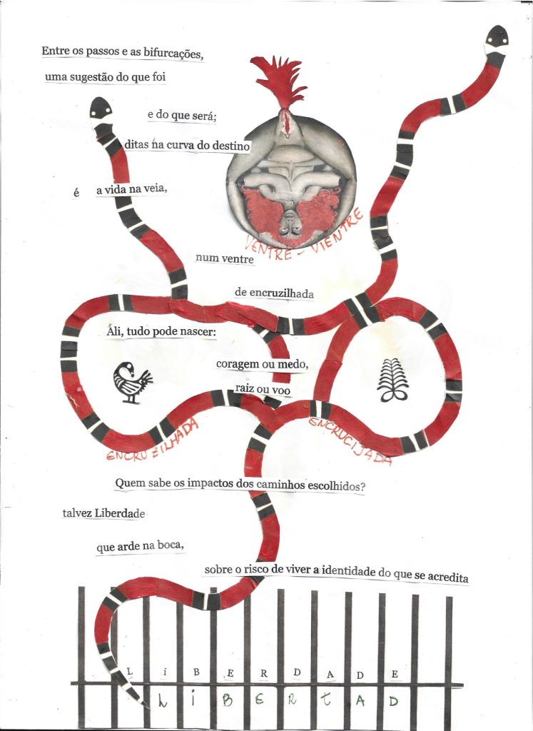 El vientre es como una encrucijada con múltiples posibilidades que se gestan, en que se conciben las decisiones que tomamos,en que la vida y el destino se encuentran para parir nuevas realidades de mí misma. Reflejada como la serpiente de coral, símbolo de regeneración, de renovación, en que el volcán de la vulva explota con su poder de muerte-vida-renacer.