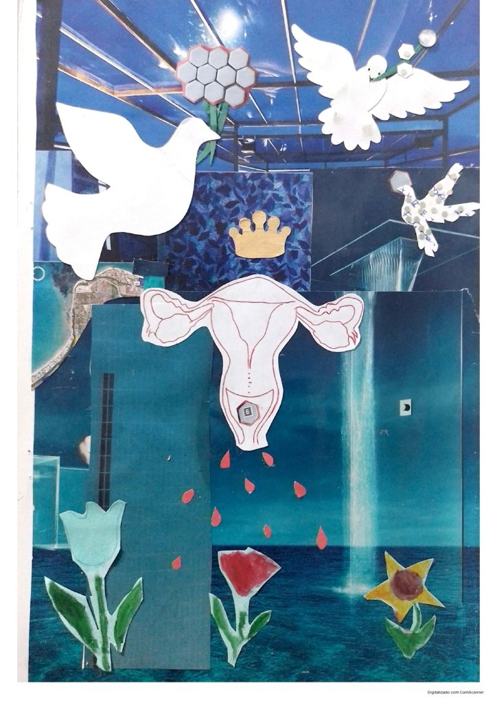 Por tanto, el collage quiere enaltecer el útero liberado, libre y autónomo. Que su sangrar no promueve sufrimiento, sino que arroja vida, alegría, afecto y fortalecimiento.